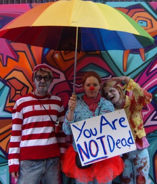 I decided to use the zombie march as it was a reasonably safe space to do something a bit out of the ordinary and to test reactions and audience interactions. The costume I put together was really a bit cobbled and could have been better – I wasn’t really sure what I was going for as long as it looked colourful and out of context against all the other zombies. All clown rules applied which was a bit confusing for others as I was only communicating using gesture, sound and eye contact.