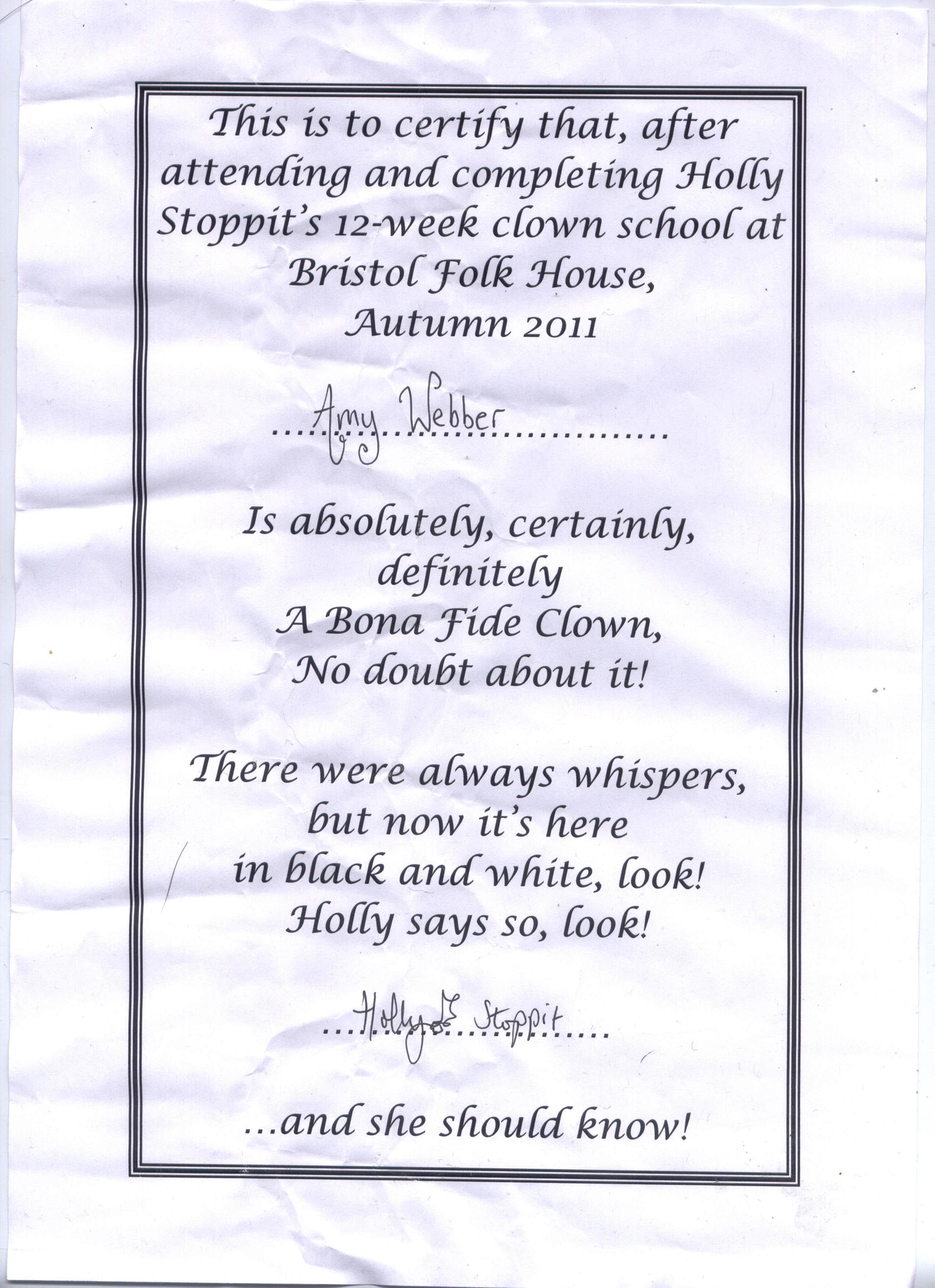 For now here is my official certificate and feedback from the rest of my troupe as to how the other clowns viewed me or my memorable moments. I’m really looking forward to next term – getting up early to sign up at the folk house was a good ideas as all the places went within 24 hours! Four of my current troupe will joining a range of other stage II clowns next term. New playmates and it’s a mix of ‘professionals’ ’emergers’ and hobbyists!!! Am I becoming clown dependent? ;-0